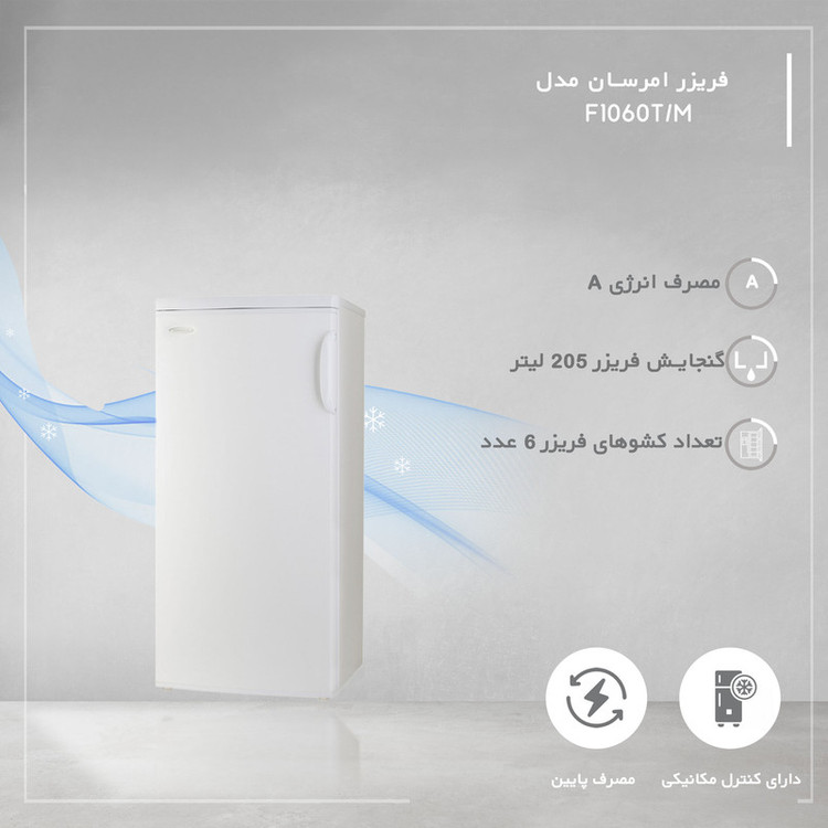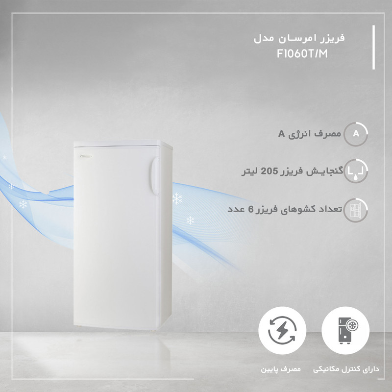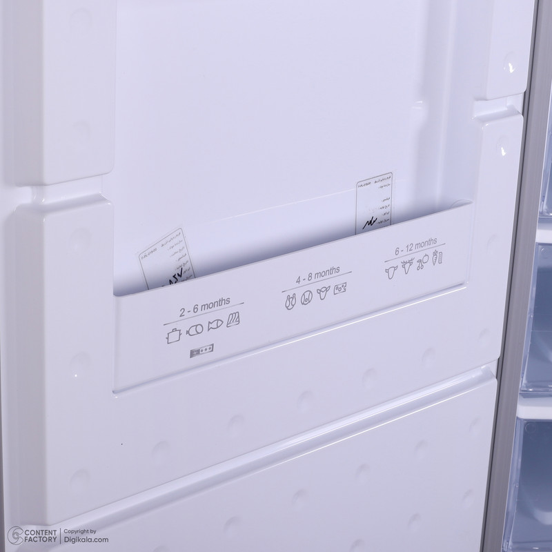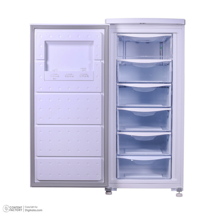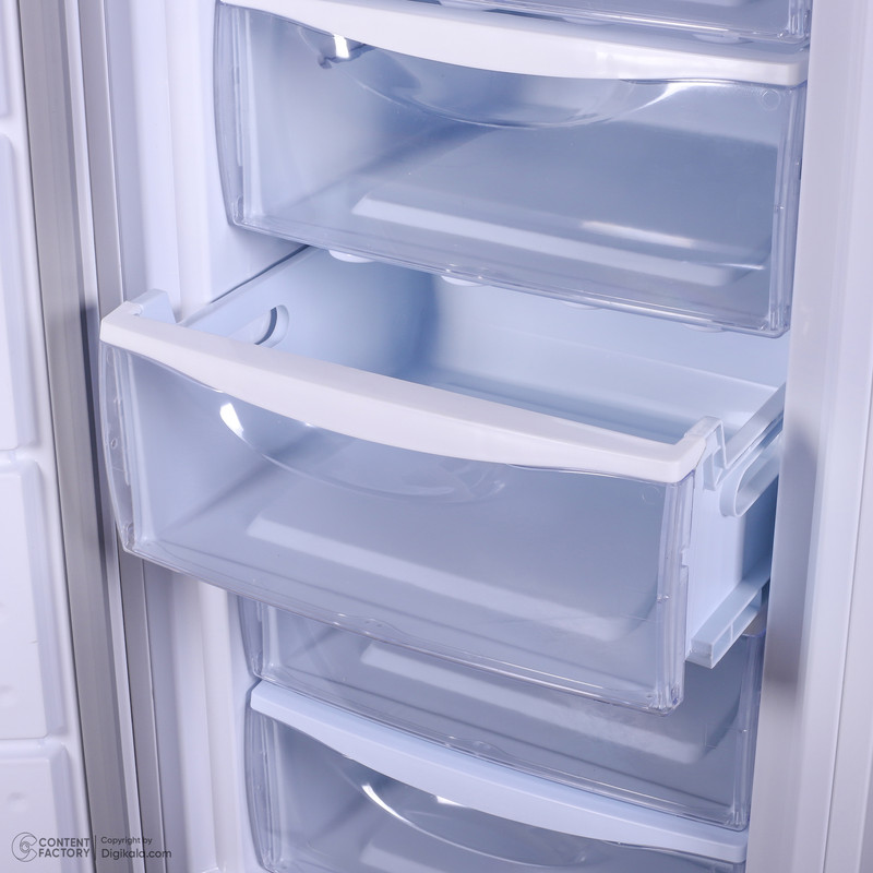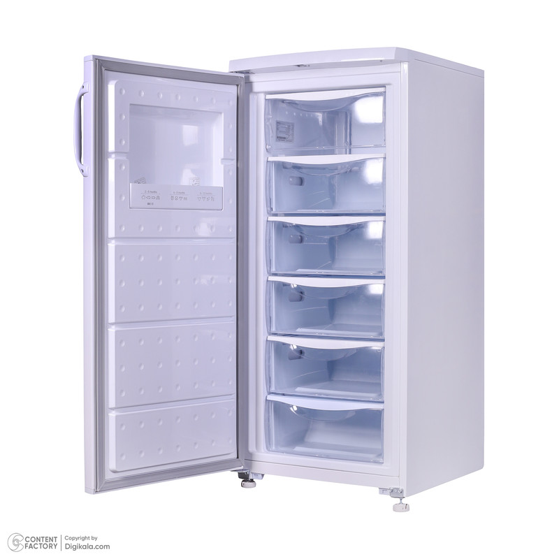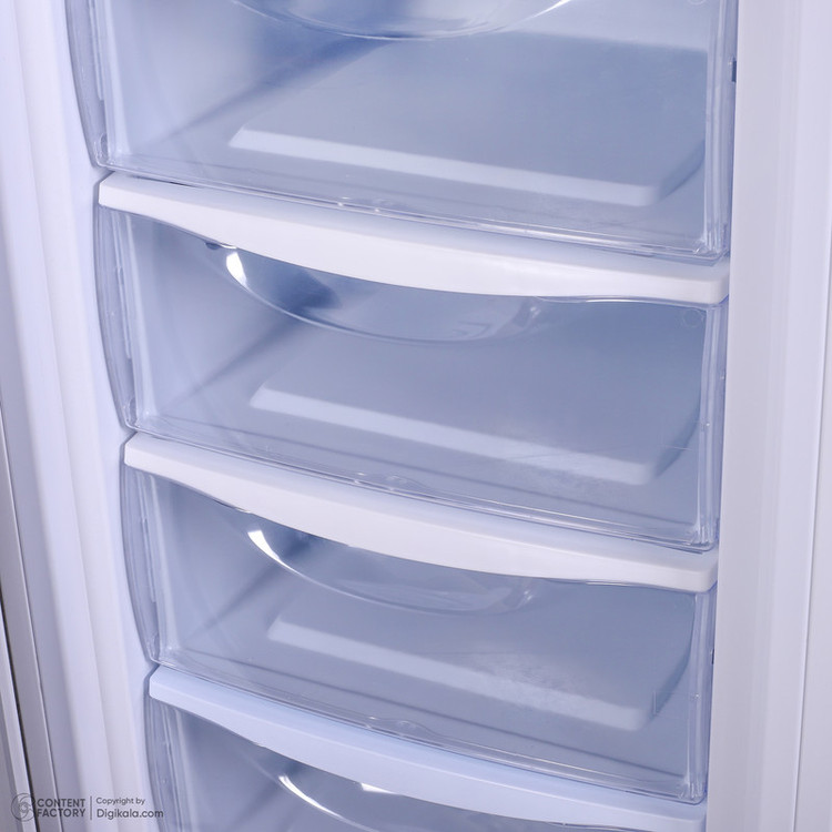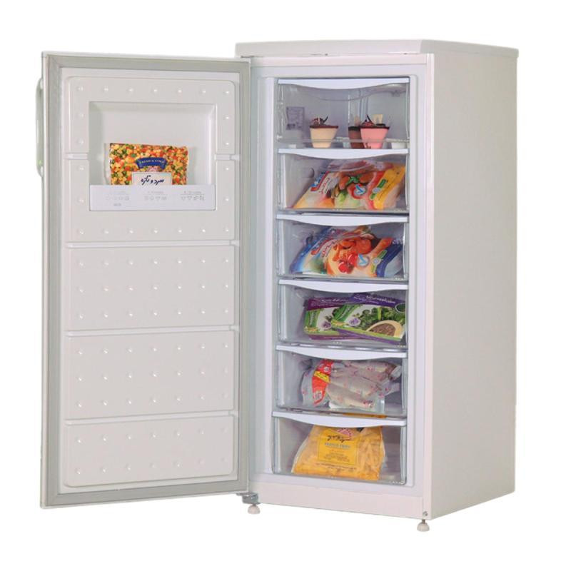 اخطار بازماندن درب فریزر / دارای کنترل مکانیکی / دارای پایههای قابل تنظیم و چرخدار / دارای کشوهای پلاستیکی / قابلیت ستشدن با یخچال مشابه