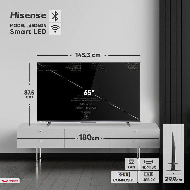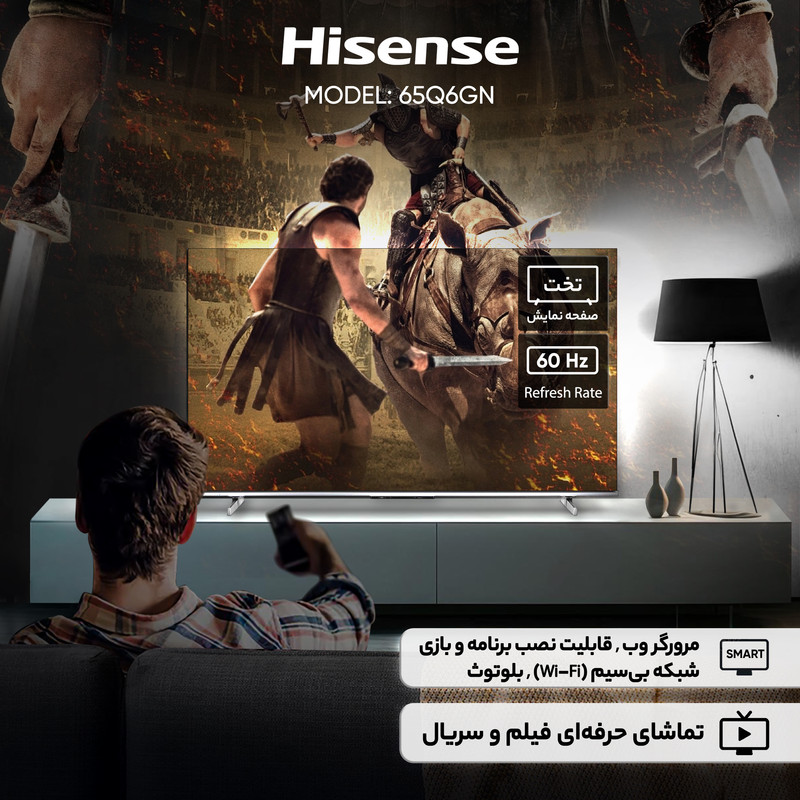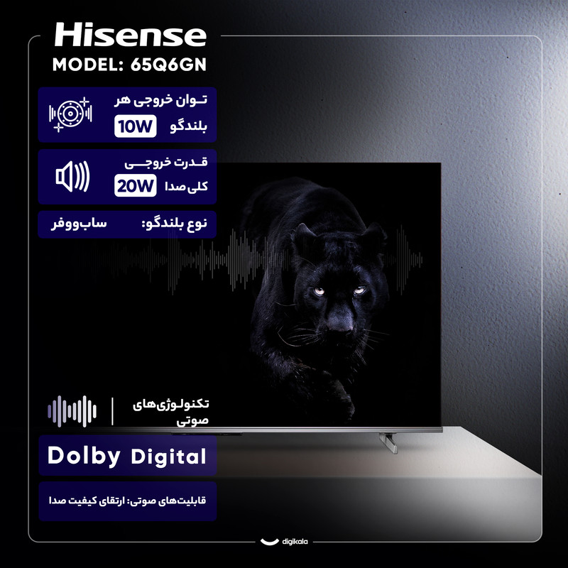 تلویزیون ۶۵ اینچ کیو ال ای دی هوشمند هایسنس مدل 65Q6GN با طراحی تخت و بهرهگیری از تکنولوژی QLED، تصویری با کیفیت 4K و رزولوشن ۲۱۶۰ × ۳۸۴۰ ارائه میدهد و نسبت تصویر ۱۶:۹ در کنار نور پسزمینه DLED و تکنولوژی Quantum Dot Colour به تولید رنگهای دقیق و زندهتر کمک میکند. پشتیبانی از فرمتهای Dolby Vision، +HDR۱۰، HDR۱۰ و HLG دامنه دینامیکی تصویر را به شکل قابل توجهی بهبود میبخشد و حالت تصویر Standard تجربه تماشای متعادلی را فراهم میکند. حداکثر نرخ بهروزرسانی ۶۰ هرتز، نمایش روان محتواهای عمومی را تضمین میکند و قابلیت ارتقاء تصویر توسط هوش مصنوعی AI Upscaler به بهبود کیفیت محتواهای با رزولوشن پایینتر کمک میکند و تکنولوژی Smooth Motion نیز حرکتها را نرمتر نمایش میدهد. زاویه دید ۱۷۸ درجه امکان مشاهده تصویر با کیفیت از زوایای مختلف را فراهم میآورد. توان خروجی کلی صدا ۲۰ وات است و تکنولوژیهای Dolby Atmos و DTS به همراه قابلیت ارتقای کیفیت صدا، تجربه صوتی فراگیر و غنی را ارائه میدهند و خروجی صوتی دیجیتال اپتیکال امکان اتصال به سیستمهای صوتی پیشرفته را فراهم میکند. درگاههای ارتباطی شامل سه درگاه HDMI ۲.۰، دو درگاه USB ۲.۰، پورت LAN، ورودی AV In، جک ۳.۵ میلیمتری صدا، ورودی آنتن، یک رابط کامپوزیت و یک رابط کامپوننت است و گیرنده دیجیتال داخلی DVB‑T امکان دریافت شبکههای تلویزیونی را فراهم میکند. سیستمعامل Android نسخه ۱۲ با پردازنده چهار هستهای، قابلیتهایی مانند شبکه بیسیم Wi‑Fi، بلوتوث، مرورگر وب، پخش آینهای، نصب برنامه و بازی، پشتیبانی از Google Play، Apple AirPlay و دستیار صوتی گوگل را در دسترس قرار میدهد. قابلیتهای اضافی مانند منوی فارسی، پشتیبانی از زیرنویس فارسی، ضبط برنامه PVR، خاموش شدن خودکار و اتصال به اینترنت، کاربرد این تلویزیون را گسترش میدهند. ابعاد تلویزیون با پایه ۱۴۵۳ × ۸۷۵ × ۲۹۹ میلیمتر و وزن آن ۱۵.۲ کیلوگرم است و شکل پایه خطی و قابلیت نصب روی دیوار، انعطافپذیری در نصب را ارائه میدهد. گرید انرژی A و منبع تغذیه AC ۲۲۰ تا ۲۴۰ ولت مصرف بهینه دستگاه را تضمین میکند و اقلام همراه شامل ریموت کنترل و دفترچه راهنما است.