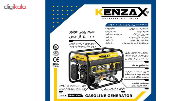 از دستگاه فوق برای تامین انرژی الکتریکی استفاده میشود. این وسیله نوعی ژنراتور برق بوده که با سوزاندن بنزین، انرژی الکتریکی تولید میکند. این دستگاه قدرت خروجی برابر 3000 وات داشته و دارای خروجیهای برق AC و DC است. موتور این محصول حجمی برابر 212 سیسی داشته و قدرت آن 4 اسب بخار است. مخزن بزرگ این دستگاه موجب شده تا کاربر بتواند سوخت زیادی را درون آن ریخته و از خالی شدن زودهنگام مخزن نگرانی نداشته باشد؛ این مخزن ظرفیتی 15 لیتری دارد. تعداد خروجیهای برق AC این دستگاه 2 عدد بوده که با اتصال دستگاههای برقی به آنها میتوانید برق مورد نیازشان را تامین کنید. این پریزها دارای درپوش ضد آب هستند تا در صورت قرار گرفتن دستگاه در محیط مرطوب، مشکلی پیش نیاید. این محصول را شرکت «کنزاکس» (Kenzax) تحت عنوان مدل «KPG-13000» به بازار عرضه میکند.