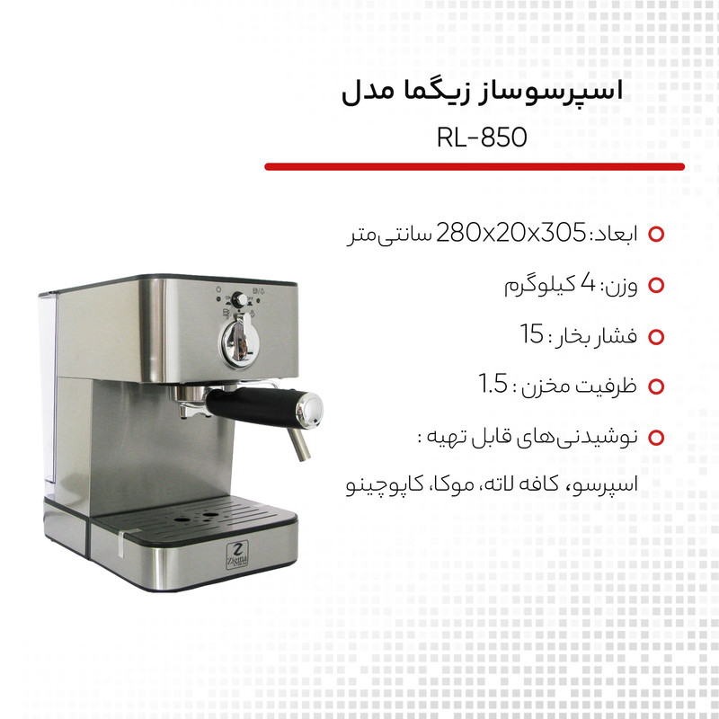 از جمله ویژگیهای این محصول داشتن موتور با فشار 15 بار و ظرفیت 850 وات قدرتمند ایتالیایی میباشد که باعث شده قهوه خروجی دارای کرمای با غلظت عالی باشد. و همچنین دارای بخار خروجی فوق العاده قوی میباشد اسپرسوساز زیگما مدل RL-850 مجهز به پیچ تنظیم بخار میباشد که امکان تهیه فوم شیر با غلظت های متفاوت را با تنظیم بخار خروجی فراهم می آورد.