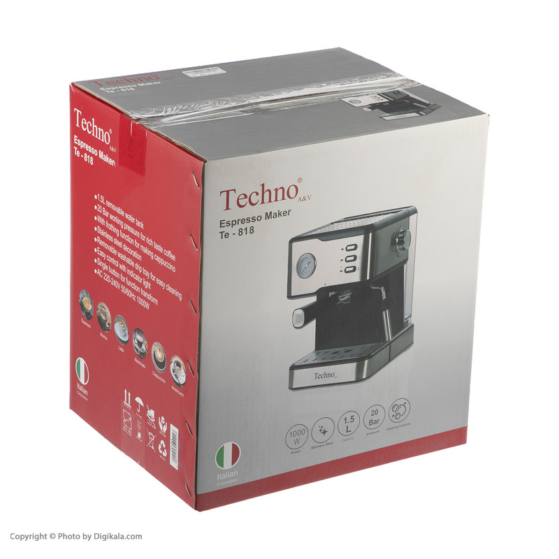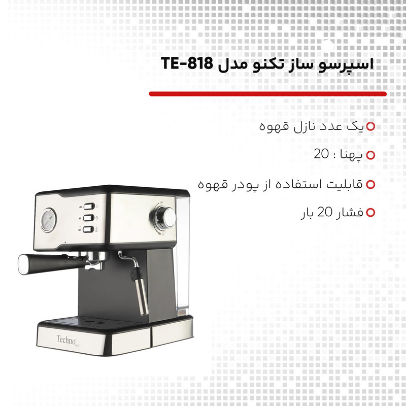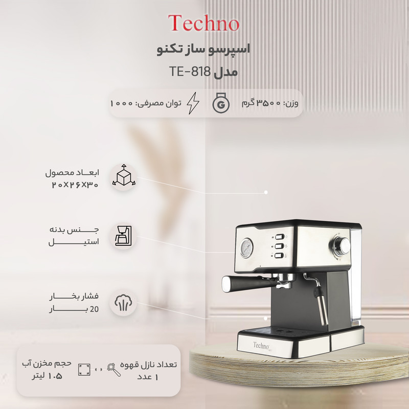 داشتن دستگاه قهوهساز خانگی برای تهیه و سرو یک فنجان قهوهی خوشطعم و تازه مناسب است و میتواند برای دوستداران این نوشیدنی پرطرفدار بسیار خوشایند باشد. اسپرسوساز مدل «TE-818» محصولی باکیفیت از برند «تکنو» است. این دستگاه یک اسپرسوساز جمعوجور با بدنهای از جنس استیل است. این دستگاه امکان تهیه اسپرسو، کاپوچینو و لاته را برای شما فراهم میکند. اسپرسوساز تکنو با توان موتور 1000 وات کار میکند و قدرت فشار بخار آن به 20 بار میرسد. نازل قهوه یک عددی است و اجازهی تهیهی یک فنجان بزرگ را به شما میدهد. مخزن آب این دستگاه اسپرسوساز در قسمت پشت آن قرار گرفته و قابلیت جدا شدن دارد. گفتنی است سینی چکهگیر قابلیت جداسازی دارد تا نظافت دستگاه آسان باشد.