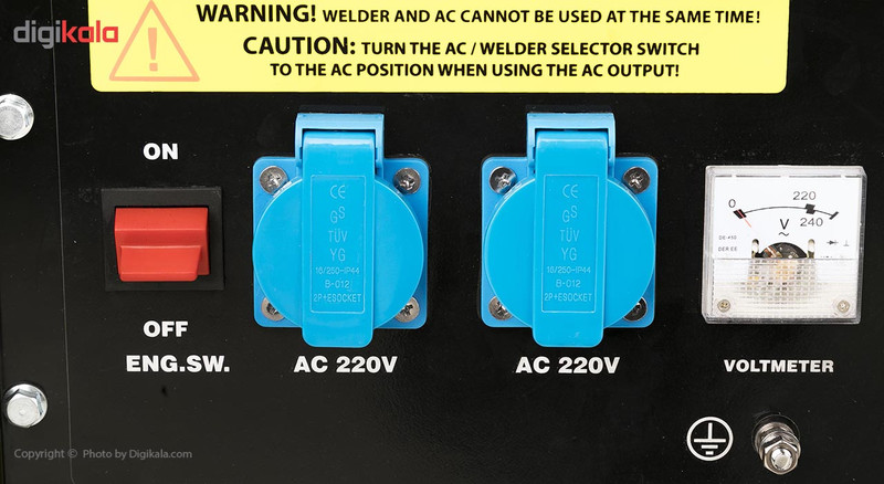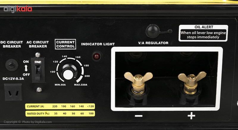 - دستگاه دوکاربره برای تولید جریان برق و جوشکاری - دارای یک جفت ترمینال برای اتصال کابل جوشکاری و انجام عملیات جوشکاری - قابلیت تنظیم شدت جریان در بازهی 50 تا 220 آمپر - چرخه جوشکاری 60 درصد با جریان 170 آمپر - دارای ولتمتر - دارای گیج مخزن سوخت