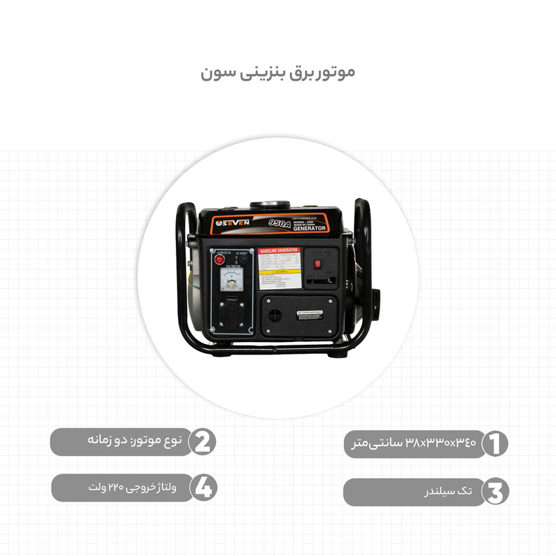 - نسبت ترکیب بنزین و روغن: 50 به 1 - دور موتور 3000 دور در دقیقه - نوع موتور: 1E45F - دارای فاکتور قدرت 1 - خروجی 12 ولت DC
